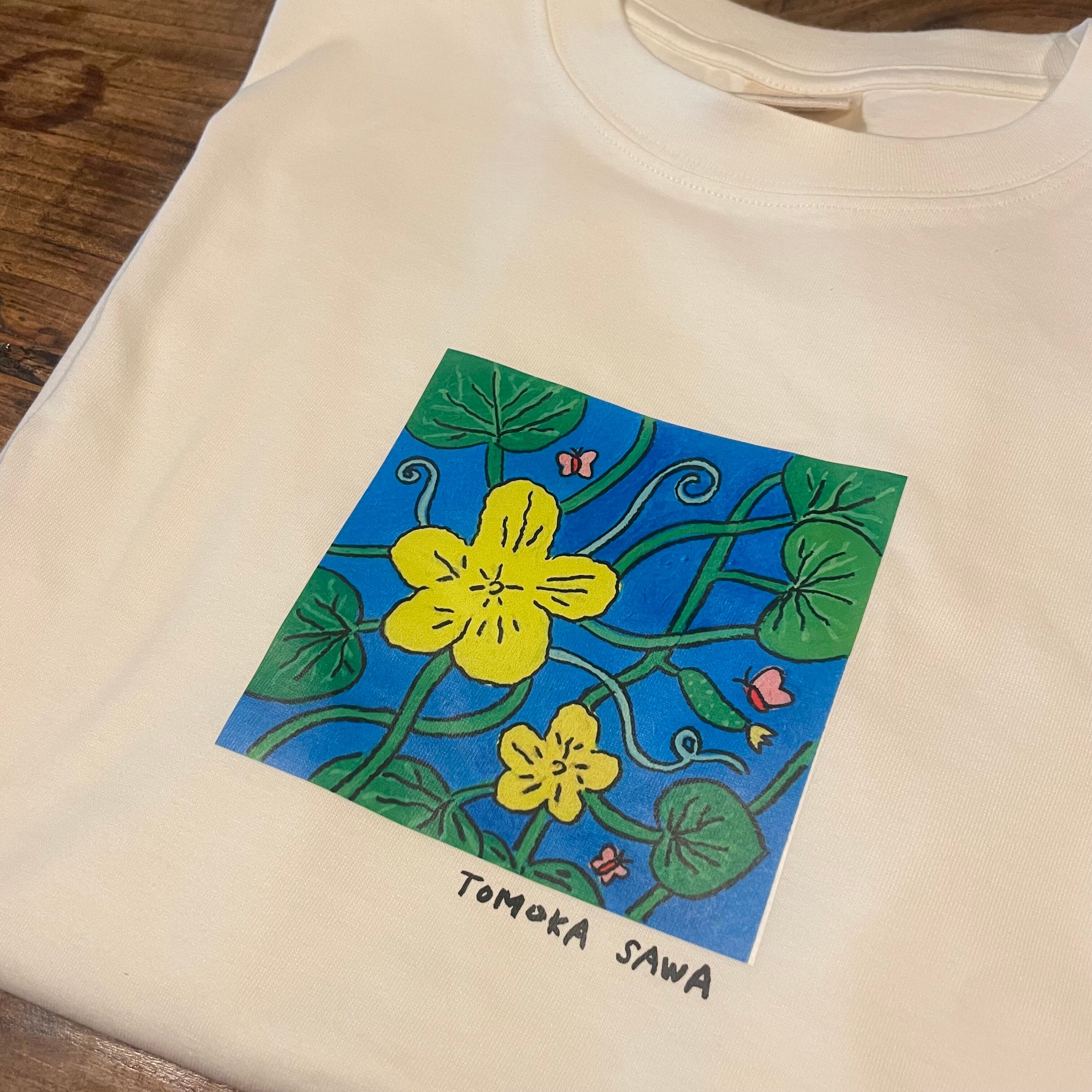 個展Livng life to liveの開催にあわせて作ったTシャツです。きゅうりの花の一枚絵がプリントされています。